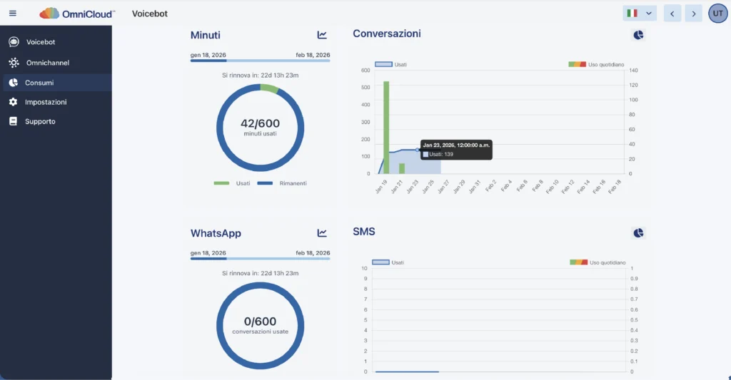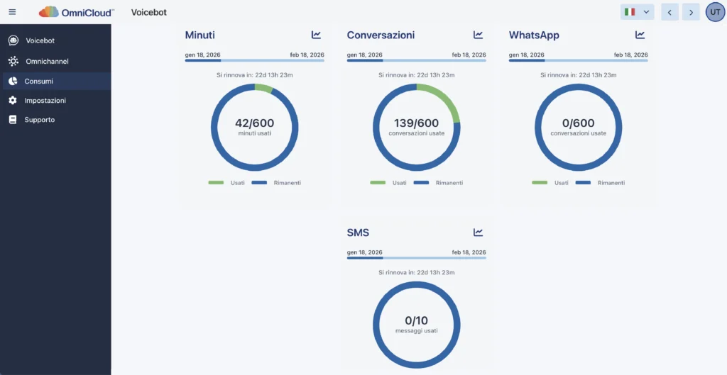 Effettua l’accesso alla piattaforma del tuo Assistente Virtuale OmniCloudCX cliccando sul link indicato nell’email precedente e utilizzando le credenziali fornite. Una volta effettuato l’accesso, potrai iniziare a configurare il tuo Assistente Virtuale OmniCloudCX, seguendo i passaggi descritti di seguito.