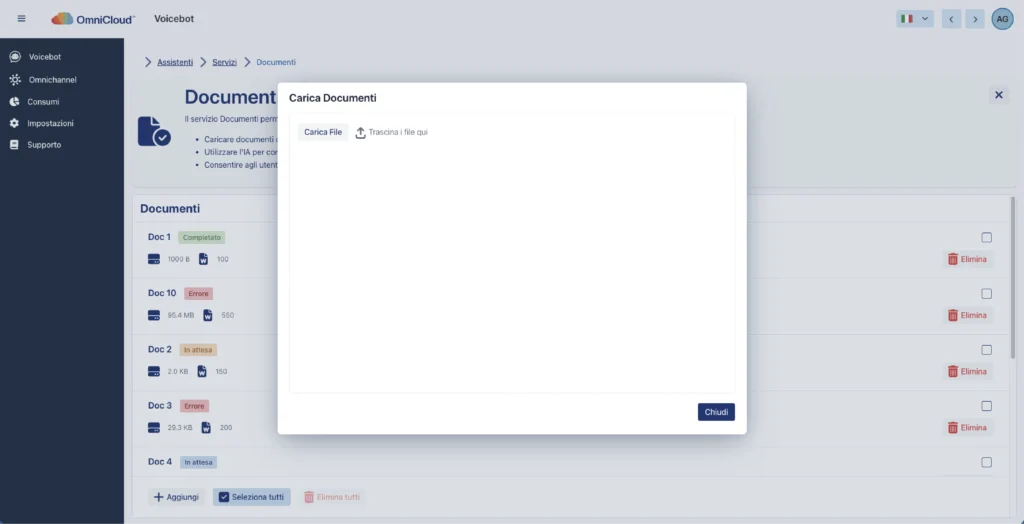 Dal bottone in basso a sinistra “Aggiungi” è possibile caricare un nuovo documento, nei formati supportati (PDF, DOCX, XLSX, PPTX, HTML, CSV), trascinandolo direttamente nella finestra di dialogo oppure cliccando su “Upload Files”. I documenti caricati verranno analizzati automaticamente dall’AI.
