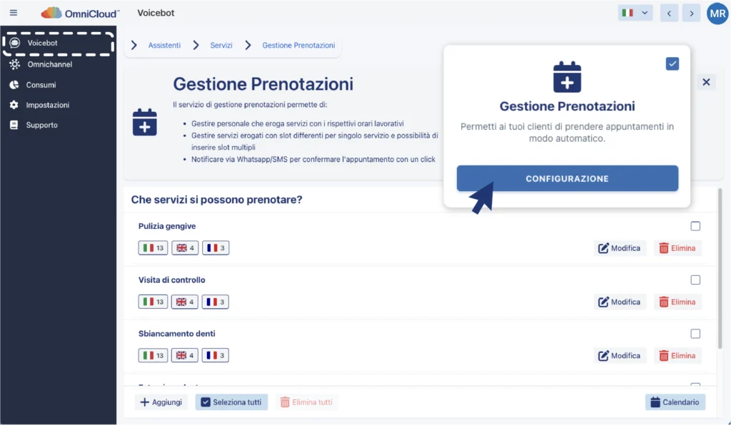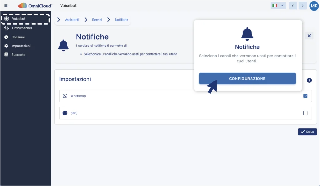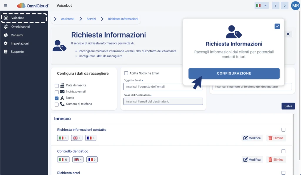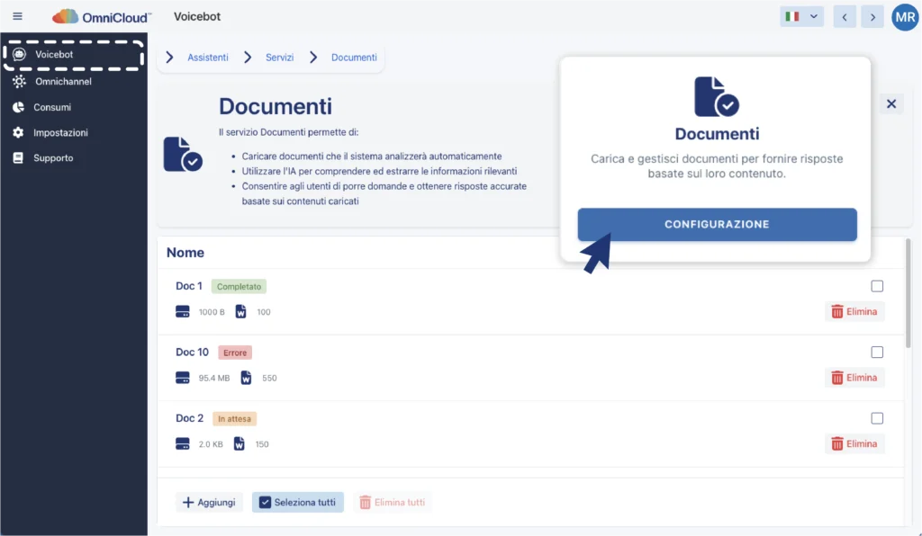 Benvenuti! Questa guida vi accompagnerà passo passo nella configurazione dell’Assistente Virtuale Voicebot, per gestire in modo efficiente le chiamate e migliorare la soddisfazione dei clienti. Contattaci dalla chat qui in basso a destra per maggior supporto!